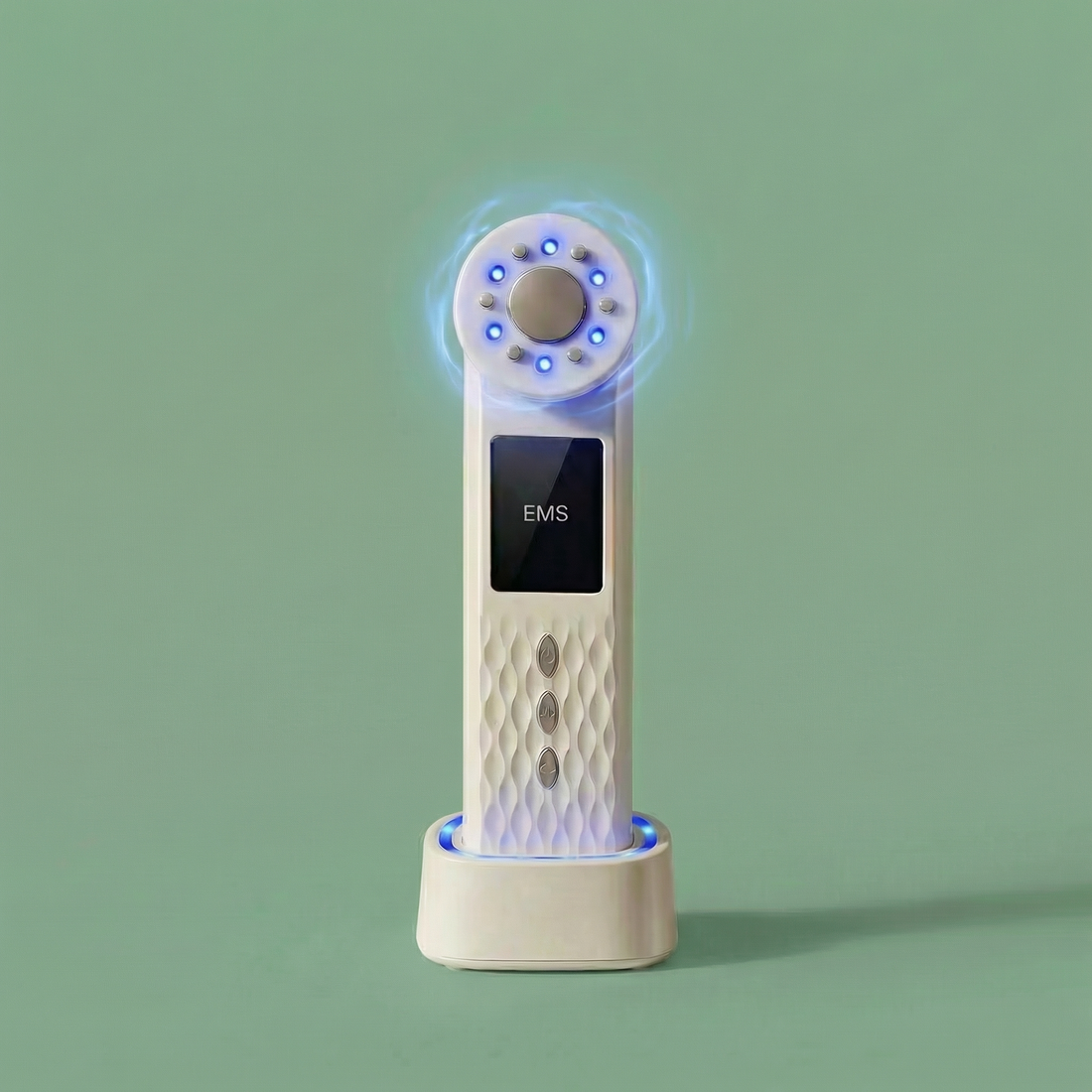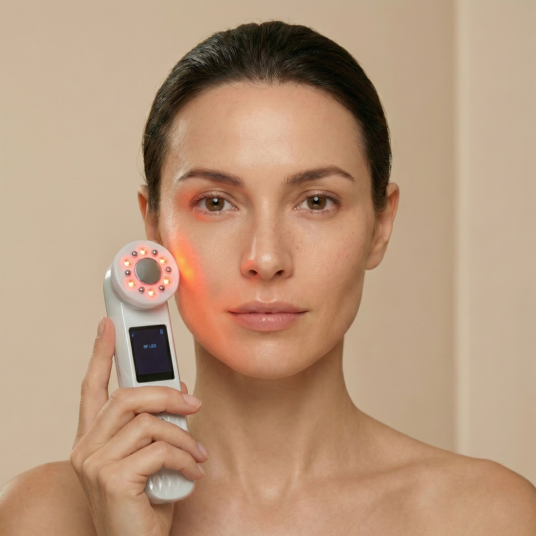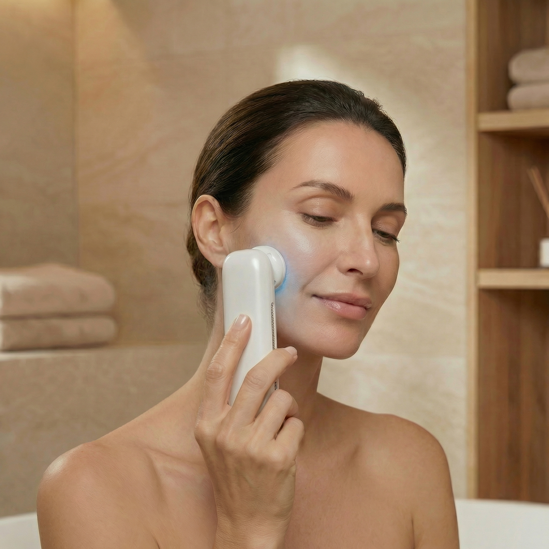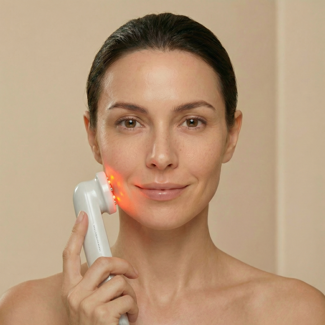 Advanced multi-technology facial system designed to support firmness, contour definition, and skin vitality — safely and progressively at home.